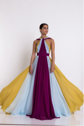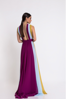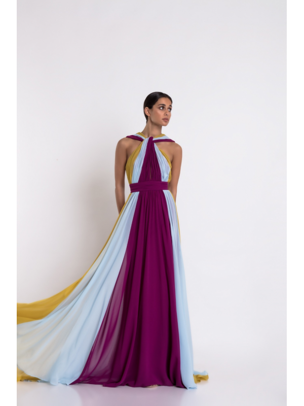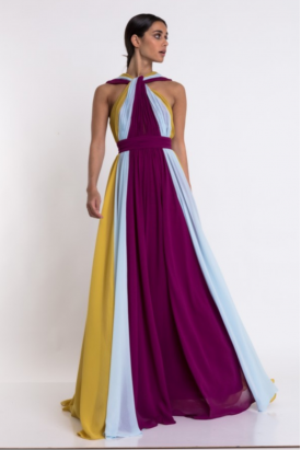 Vestido longo fluído tricolor com decote halter efeito nó, costas abertas