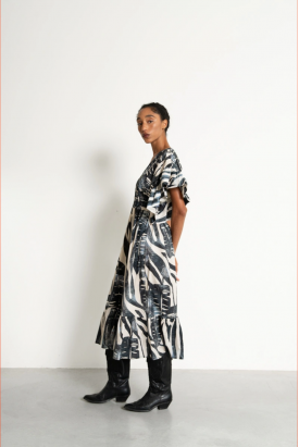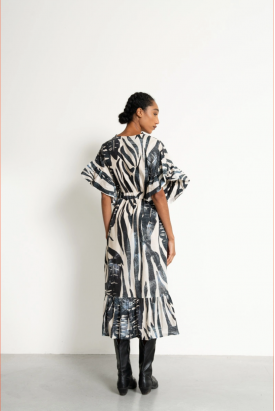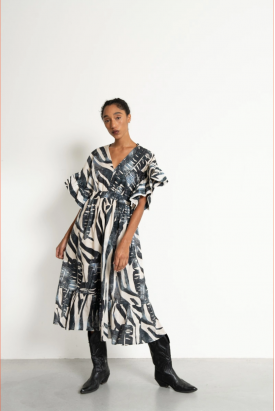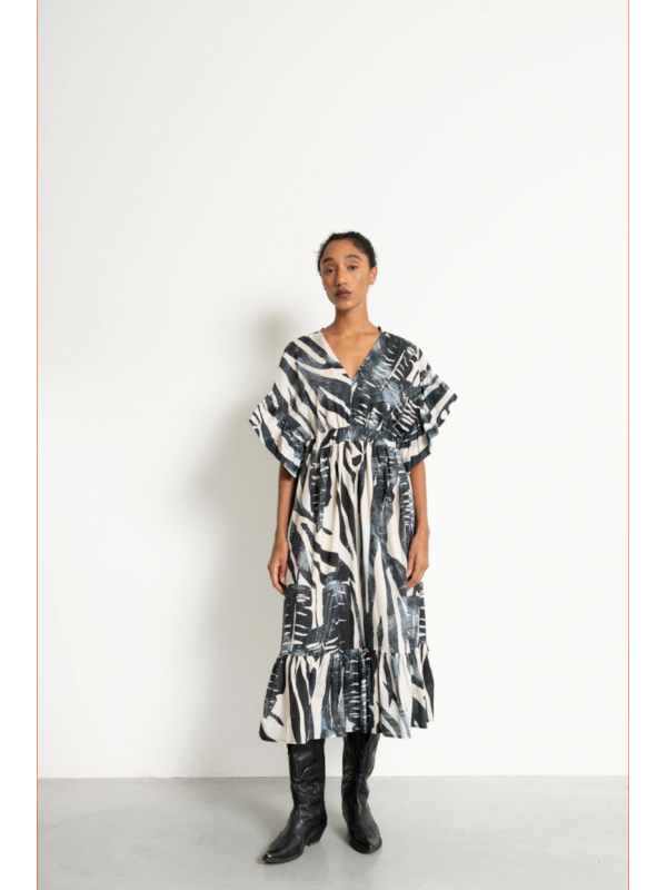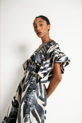 Mangas e base com folhos. Decote em V e elástico na cintura