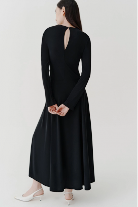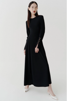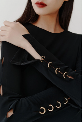 mangas compridas com detalhe de argolas nos punhos e aberturas laterais ao longo da manga