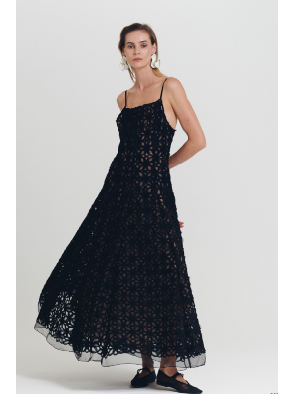 vestido preto longo em tule com flores em relevo