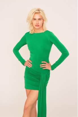 Vestido mini justo, tecido elástico, com saia drapeada e laço. Ideal para a noite.